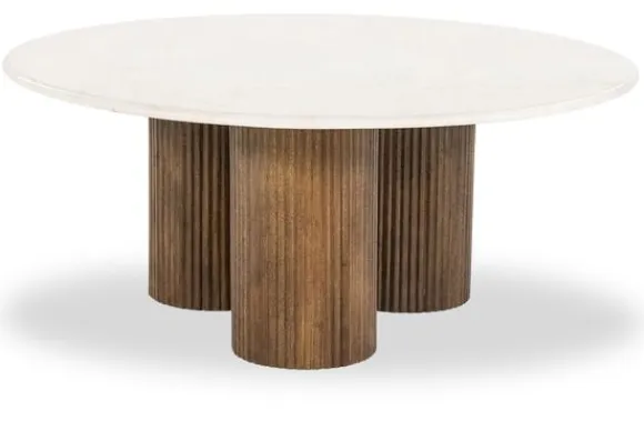 De drie ronde tafelpoten dragen het marmeren blad en geven de tafel een uniek karakter. Hun verticale structuur en warme tint contrasteren prachtig met het lichte marmer. Deze combinatie van robuuste vormen en verfijnde afwerking creëert een harmonieuze balans, waardoor Salontafel Xavi een ware blikvanger wordt in iedere woonruimte.
