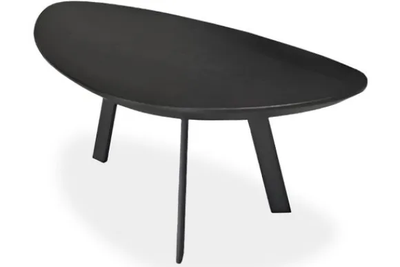 Het tafelblad heeft een kiezel vorm en is afgewerkt met een tapse rand. Het blad is 2,5 cm dik. Onder deze salontafel vind je drie rechte poten.