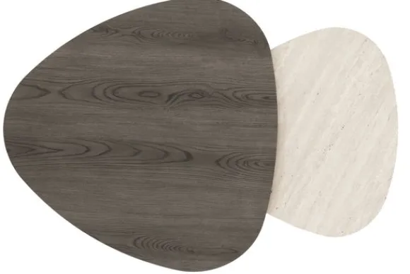 Salontafelset Jexar van het merk Ideco bestaat uit 2 salontafels van B80 x D80 x H42 cm en B60 x D60 x H35 cm. De organische tafels zijn hier te zien in de kleuren Mystic Wood en Travertin Stone met een gepoedercoat metalen onderstel in de kleur bruin.