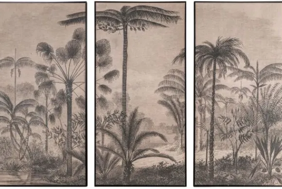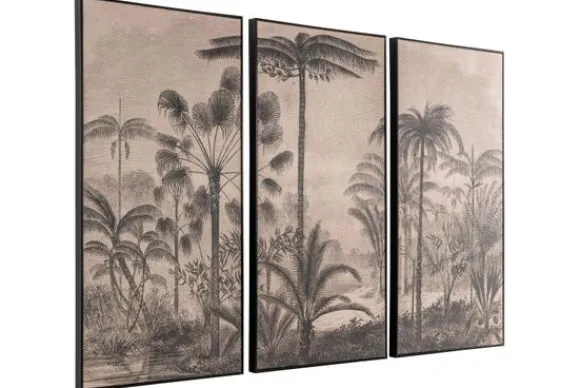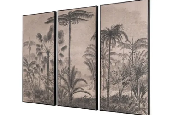 Schilderij Rhapsody 214073 van het merk Richmond Interiors is een set van drie panelen met een tropisch landschap in zachte beige tinten. De zwart omlijnde panelen vormen samen een stijlvol geheel dat meteen sfeer brengt in de ruimte.