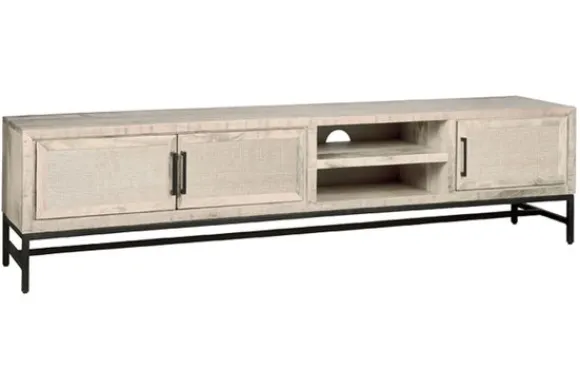 Tv-meubel Carini NA 0061W van het merk Tower Living is gemaakt van hout en webbing en staat op een metalen onderstel. Deze materialen zijn helemaal van deze tijd. De kast heeft drie deuren en twee open vakken. Ook is deze kast verkrijgbaar met twee deuren. De Renew collectie is ideaal om de lege plekken in je interieur mee op te vullen! Met veel soorten producten in verschillende stijlen, kleuren en materialen zit er voor iedereen wel wat tussen.