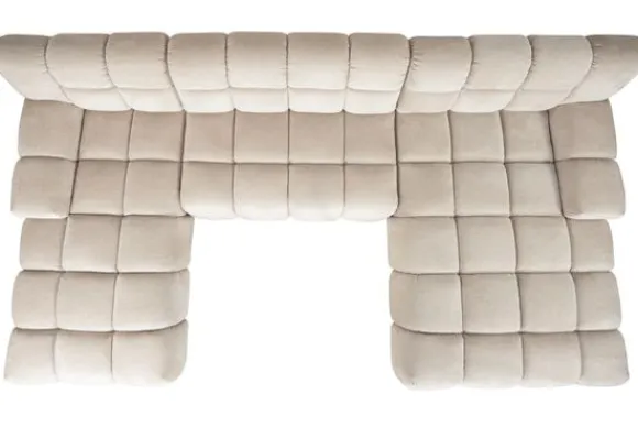 Bankstel Trentino van het merk Moderno is een bank met geblokte zit- en rugkussens en een zitting die doorloopt tot net boven de grond.