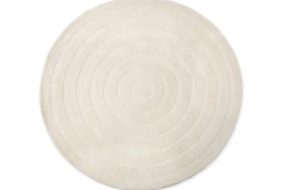 Het vloerkleed heeft een ronde vorm en valt op door zijn strakke lijnen en geometrische patroon. De cirkelvormige lijnen creëren een subtiel maar opvallend design, wat zorgt voor een speels effect zonder te overheersen. Dankzij de ronde vorm breekt het kleed de rechte lijnen in een ruimte, wat het geheel zachter en harmonieuzer maakt.
