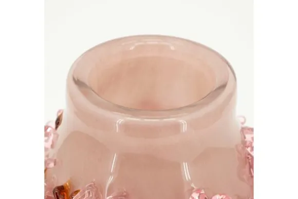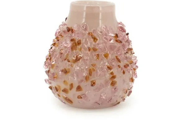 De zachte roze tint wordt verrijkt met ruwe, kristalachtige details in warme amber- en rosétinten. Dit zorgt voor een bijzondere textuur en een fascinerend lichtspel. Door het ambachtelijke proces kunnen dikte, kleur en onregelmatigheden variëren, wat bijdraagt aan de unieke charme van de vaas.