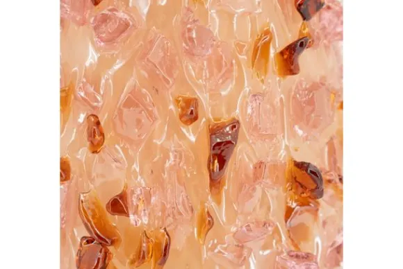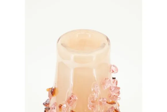 De vaas heeft een unieke afwerking waarbij transparante en amberkleurige glasfragmenten als edelstenen over het oppervlak lijken te zijn gestrooid. Dit zorgt voor een fascinerend lichtspel en een dynamische textuur die direct de aandacht trekt.