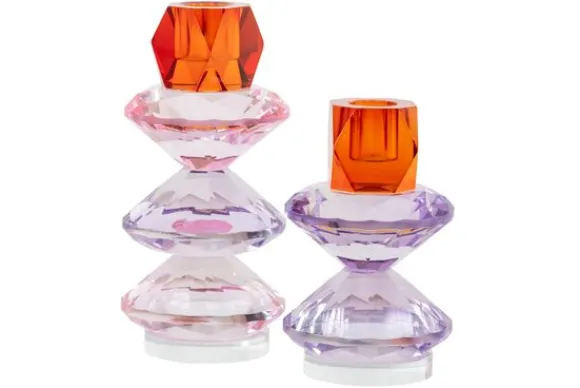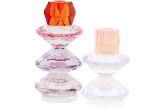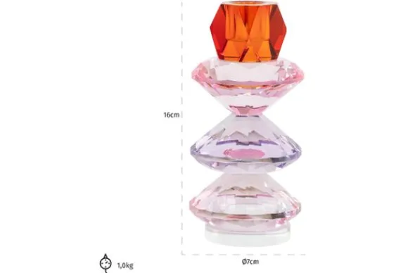 Kandelaar Yalena 212686 van het merk Richmond Interiors is vervaardigd uit glas. De kandelaar heeft een unieke uitstraling door de verschillende vormen. De kandelaar is doorzichtig roze, paars en oranje van kleur en is geschikt voor dinerkaarsen.