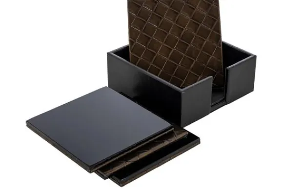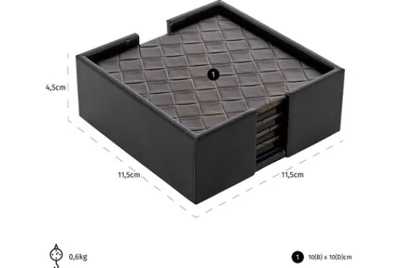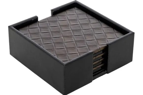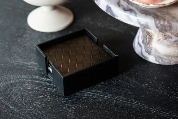 Onderzetters Yora 211495 van het merk Richmond Interiors zijn gemaakt van hout in combinatie met kunstleder. De onderzetters hebben een vierkante vorm en zijn voorzien van een gevlochten blokjesprint. De onderzetters bestaan uit een set van vier onderzetters en een houder. Handig om te gebruiken op de tafel wanneer je een lekker drankje aan het drinken bent en je je glas eventjes wilt neerzetten op de tafel.