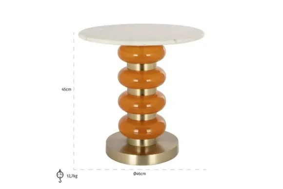 Bijzettafel Boann 212584 van het merk Richmond Interiors heeft een blad gemaakt van marmer. Marmer is een duurzame steensoort en heeft een luxe en stijlvolle uitstraling. De steensoort is een natuurproduct en kenmerkt zich door de unieke afwerkingen en kan zowel grove al gladde delen bevatten. Door de kenmerkende kleurschakeringen en aders is geen product hetzelfde. Zo haal je met een marmer product dus echt iets unieks in huis. De bollen van de poot zijn gemaakt van glas in de kleur oranje met als afwisseling ertussen brass (staal in mat goud).