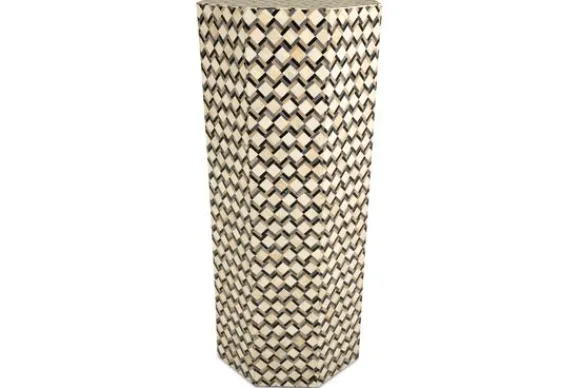 Deze bijzettafel is bekleed met een mozaïekachtig patroon in warme beige- en zwarttinten, wat zorgt voor een levendig en grafisch effect. Door de zeshoekige vorm krijgt het geheel een moderne, bijna kunstzinnige look.