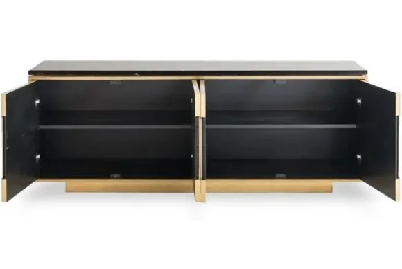 Dressoir Finsbury 212599 van het merk Richmond Interiors is gemaakt van brass (staal in mat goud) met een marmeren blad. Brass is een legering van koper en zink, dat vervolgens wordt afgewerkt met een geborsteld effect. Dit zorgt voor een matte afwerking. Brass is eenvoudig schoon te maken met een lichtvochtige doek, het nadrogen van het oppervlak zorgt voor een streeploos resultaat. Marmer is een duurzame steensoort en heeft een luxe en stijlvolle uitstraling. De steensoort is een natuurproduct en kenmerkt zich door de unieke afwerkingen en kan zowel grove als gladde delen bevatten. Door de kenmerkende kleurschakeringen en aders is geen product hetzelfde. Zo haal je met een marmer product dus echt iets unieks in huis. Dit dressoir is voorzien van vier deurtjes met daarachter één plank die de ruimte in tweeën deelt, hierdoor heb je genoeg opbergruimte voor jouw spullen.