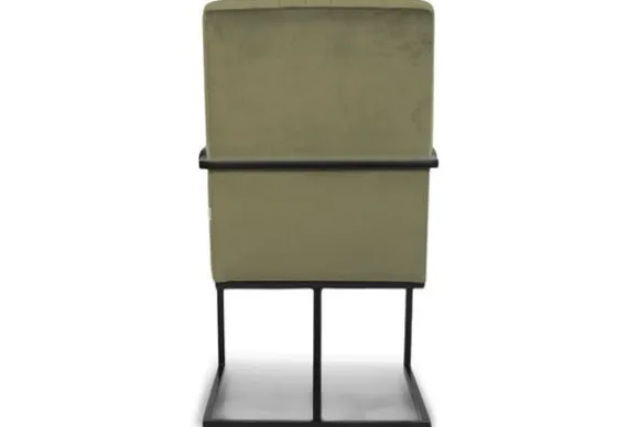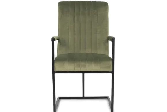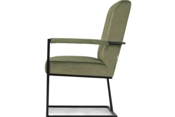 Deze stoel wordt standaard uitgevoerd met zwart stalen poten die doorlopen tot armleuningen. De armleuning zijn gestoffeerd.