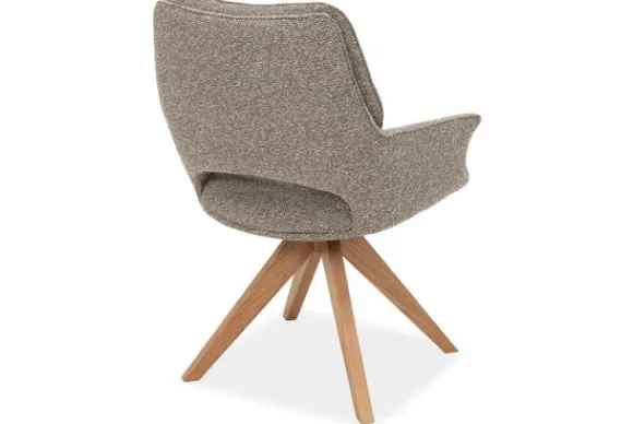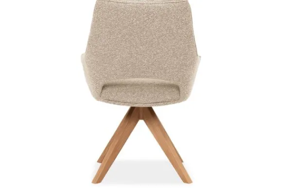 Eetkamerstoel Selene is samen te stellen met vier verschillende onderstellen van metaal of hout. Afhankelijk van het gekozen onderstel is de stoel 180 graden of 360 graden draaibaar. Bij deze uitvoering is gekozen voor een houten poot in de kleur naturel die 360 graden draaibaar is en is voorzien van autoreturn.