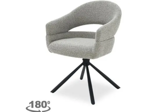 Eetkamerstoel Linn van het merk Livingfurn is een eigentijdse draaistoel met een warme uitstraling en subtiele flair. De grove, gemĂȘleerde stof in een zachte grijsgroene tint geeft de stoel een luxe textuur die uitnodigt tot zitten. De afgeronde rug en open rugdetail zorgen voor een luchtige look die stijlvol en comfortabel aanvoelt.