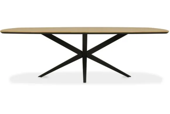 Eettafel Hawea van het merk Lamulux, hier afgebeeld in de kleur blond oak, is beschikbaar in diverse afmetingen en kleuren. De tafel is voorzien van een zwart metalen spinpoot. De tafel heeft een deens ovale vorm met een tapse rand.