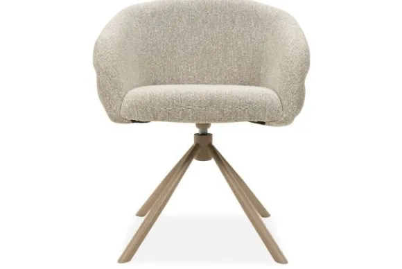 Eetstoel Pleko van het merk Divani is een moderne draaistoel die comfort en functionaliteit stijlvol samenbrengt. De zitting heeft een ronde, uitnodigende vorm met een zachte rug en geïntegreerde armleuningen die zorgen voor een geborgen en comfortabele zit. De stoel is uitgevoerd in de stof Lodge Shiitake 124.