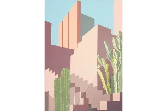 Glasschilderij Botanical Stairs van het merk Urban Cotton toont een geometrisch en abstract landschap met een architectonisch karakter. Het ontwerp is een samenspel van rechte lijnen en gelaagde vlakken in zachte, aardse tinten zoals beige, roze en terracotta, gecombineerd met een helderblauwe lucht op de achtergrond. Links en rechts zijn verschillende cactussen te zien in diverse groentinten, die zorgen voor een speels contrast met de strakke vormen van de trappartijen en gebouwen.