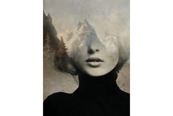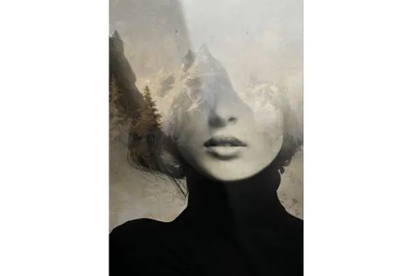 Glasschilderij Head in the Sky van het merk Urban Cotton combineerd een vrouwelijk gezicht met een berglandschap in zachte aardetinten. Dit kunstwerk brengt een serene en introspectieve sfeer, perfect voor minimalistische interieurs of als focuspunt in een rustige omgeving.