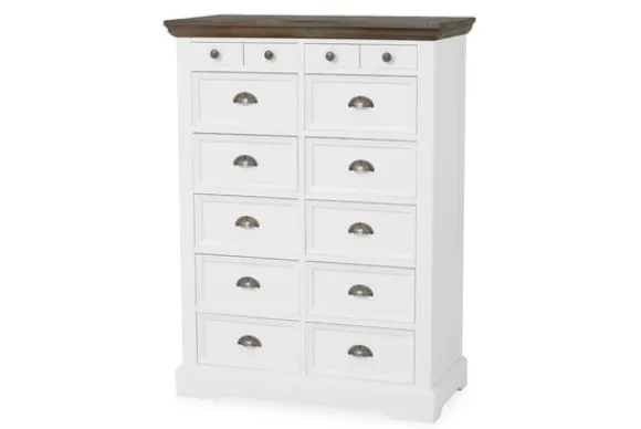 Ladekast Fleur DD 0020C van het merk Tower Living wordt geleverd in de kleur wit. De eiken delen worden licht geborsteld en afgewerkt met een olie. Je kunt de kast makkelijk schoonmaken met een zachte vochtige doek. Deze kast heeft veertien lades, dus deze kast heeft genoeg opbergruimte.