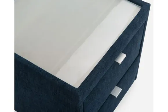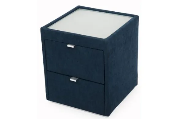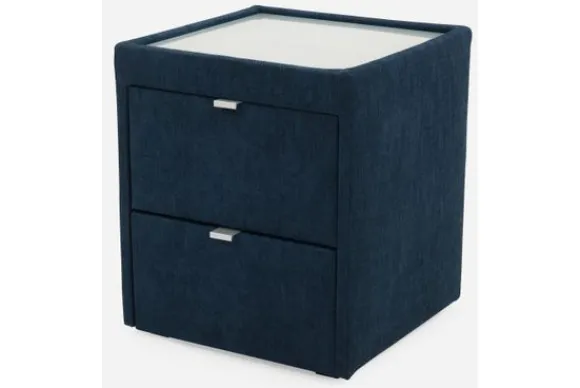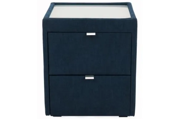 Nachtkast Chavela van het merk Eco Bedding is beschikbaar in alle kleuren en in verschillende materiaalsoorten zoals stof, kunstleder en rundleder. Je kunt kiezen uit twee kleuren voor de greepjes. Dit nachtkastje heeft een simpel design en is voorzien van twee lades om spullen in op te bergen en heeft bovenop een glasplaat.