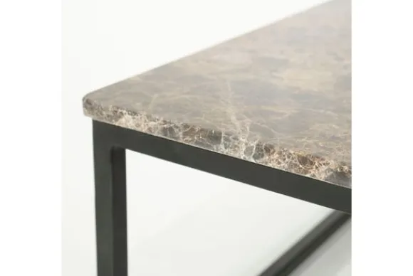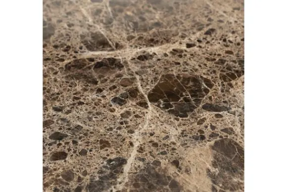 Salontafel Rico 96331 van het merk Eleonora combineert een verfijnd marmeren blad met een strak metalen onderstel van gecoat ijzer. De diepbruine marmerstructuur, vol karakteristieke adering, vangt het licht in een subtiele dialoog tussen glans en schaduw. De gepolijste afwerking geeft het oppervlak een luxe uitstraling die naadloos aansluit bij een stijlvol interieur.