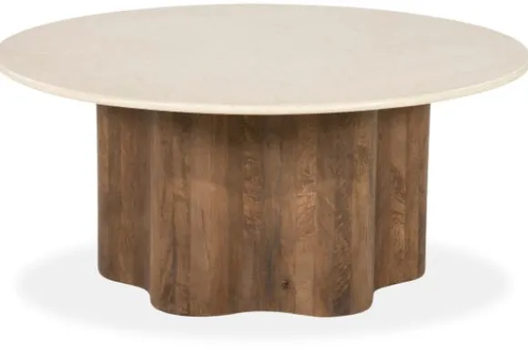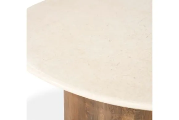 Salontafel Bodhi 96580 van het merk Eleonora is uitgevoerd met een rond blad van botochino en een brede voet van mangohout. Het blad heeft een lichte tint met subtiele kleurnuances en een glad oppervlak. De voet heeft een warme bruine kleur en toont een duidelijke houtstructuur. De vorm van de voet is rond en licht golvend afgewerkt. Dit zorgt voor een stevige en stabiele constructie.