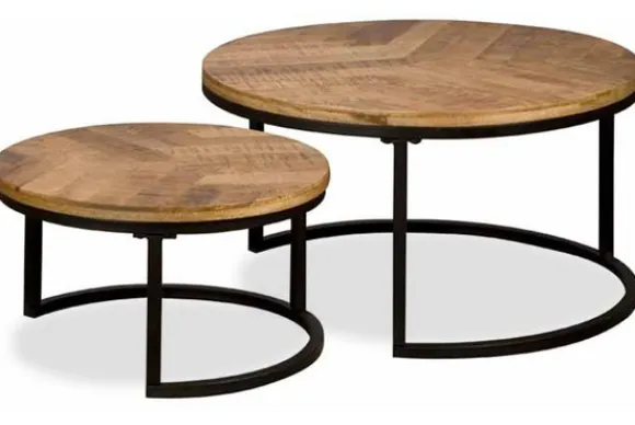 De salontafels hebben een blad van mangohout met een zichtbaar visgraat motief in een 3 punt patroon. Mangohout heeft natuurlijke kleurschakeringen en verschillen in het oppervlak, waardoor elke tafel uniek is. Het onderstel is gemaakt van zwart gecoat staal en zorgt voor een stevige basis.