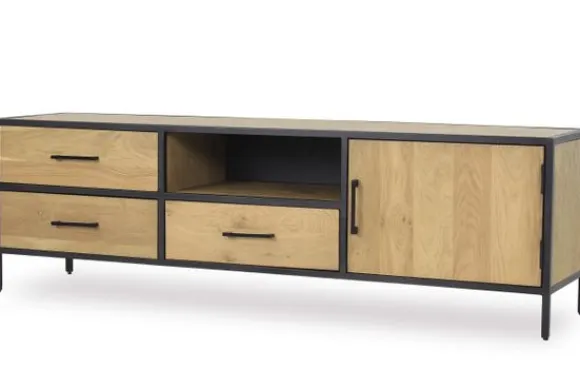 Tv-meubel Luna NA 0083 van het merk Tower Living is onderdeel van een compleet woonprogramma. Deze meubelen zijn gemaakt van gefineerd eiken en worden gecombineerd met een metalen frame in de kleur gun metal. De prachtige houtkleur is verkregen door het eikenhout te roken. Voor een gemakkelijk onderhoud worden de meubelen met een matte lak afgelakt. Strakke lijnen en natuurlijke kleuren kenmerken deze meubelserie. Deze kast is voorzien van drie lades, één open vak en één deur.