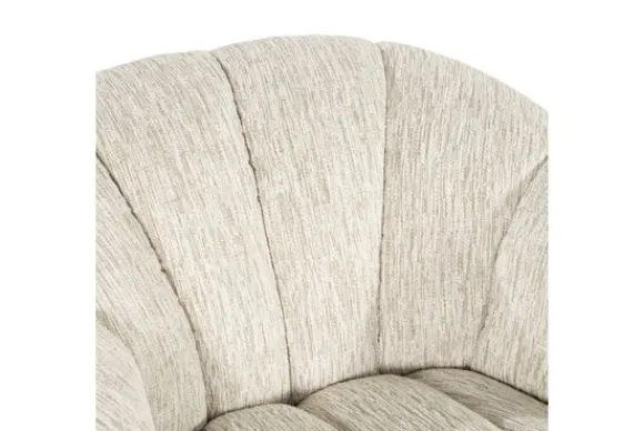 De ronde, organische vormen en de zachte verticale plooien in de bekleding geven de fauteuil een chique en uitnodigende uitstraling. Uitgevoerd in een polyester stof voelt de zitting heerlijk zacht aan en voegt hij een warme, rustgevende sfeer toe aan het interieur.