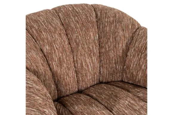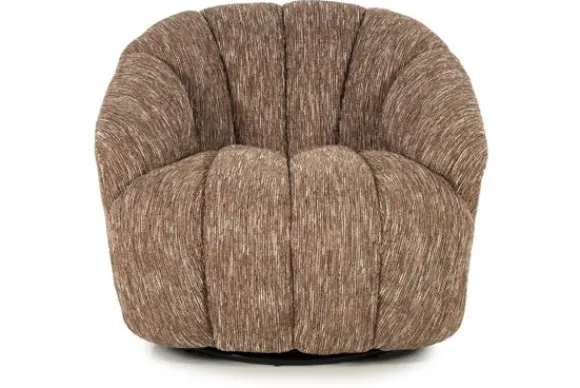De ronde, organische vormen en de zachte verticale plooien in de bekleding geven de fauteuil een chique en uitnodigende uitstraling. Uitgevoerd in een polyester stof voelt de zitting heerlijk zacht aan en voegt hij een warme, rustgevende sfeer toe aan het interieur.