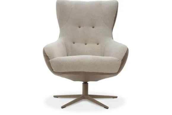 Fauteuil Borg staat op een stervormige draaipoot in een kleur naar keuze, wat een modern accent geeft. Op de afbeelding is de fauteuil uitgevoerd in duo-stoffering met Bull 10 en Macan 01. Dankzij de optie tot duo-stoffering, waarbij je twee materialen of kleuren combineert, kun je de fauteuil volledig personaliseren. Voor duo-stoffering kun je contact opnemen met de .