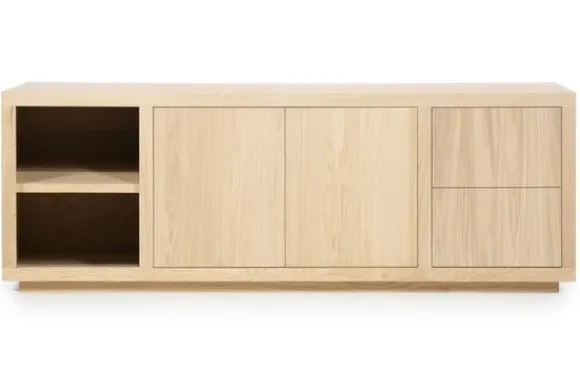 Het dressoir heeft twee deuren, twee lades en twee open vakken. Deze indeling biedt praktische opbergruimte voor servies, accessoires of papieren. De open vakken geven het meubel een open en functioneel uiterlijk. Het dressoir maakt deel uit van de Helsinki met bijpassende meubels.