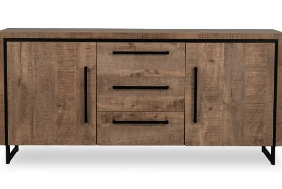 Dressoir Lingo – Rimini van het merk Lamulux is uitgevoerd in de kleur Mango en staat op zwarte metalen sledepoten. De kast biedt praktische opbergruimte met twee deuren en drie lades. Smalle metalen handgrepen geven het dressoir een stoere en strakke uitstraling.
