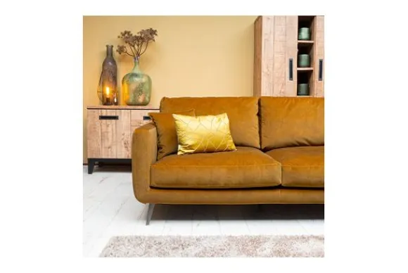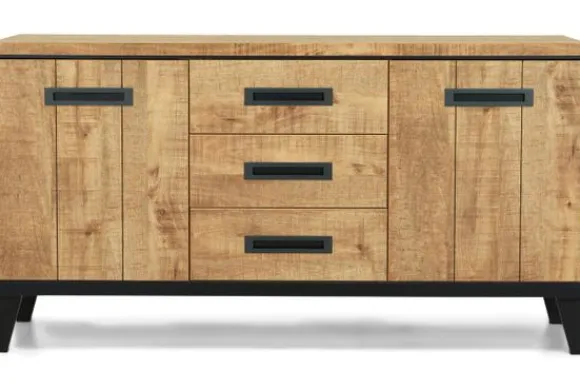 Dressoir Lucania – Union van het merk Lamulux is uitgevoerd in de kleur Mango en heeft een stoere uitstraling. De combinatie van hout met metalen poten en handgrepen geeft het dressoir een krachtig en eigentijds karakter. De kast is praktisch ingedeeld met twee deuren met verticale planken en drie lades in het midden.