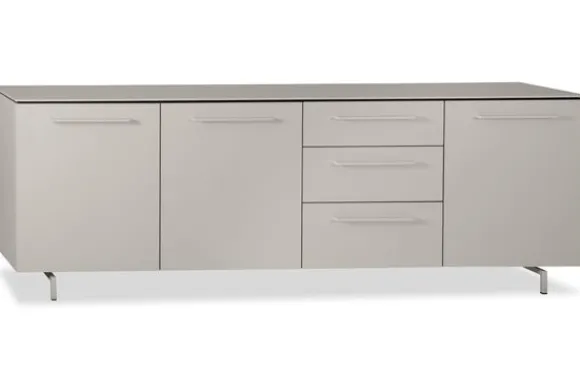 Dressoir Ortega van het merk Lamulux is een modern dressoir met een rustige en tijdloze uitstraling. De ivoorkleur en strakke lijnen zorgen voor een helder geheel dat goed past in een modern, Scandinavisch of Japandi interieur. De handgrepen in dezelfde kleur en de metalen pootjes geven het meubel een lichte en moderne basis.