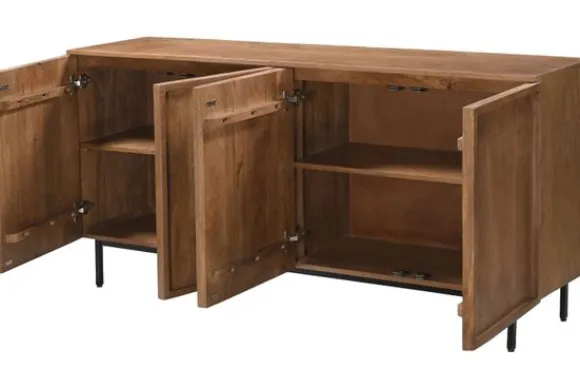 Het dressoir is voorzien van vier openslaande deuren en biedt daarmee ruime opbergruimte voor servies, woonaccessoires of andere spullen. Dressoir Elan maakt deel uit van een met bijpassende meubels.