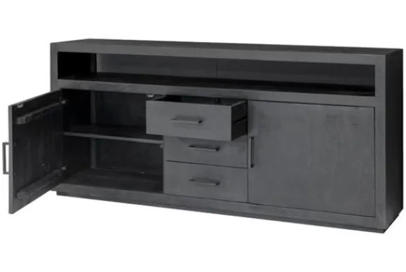 In het midden van het dressoir bevinden zich drie lades. Aan weerszijden is een deur geplaatst voor extra opbergruimte. Bovenin zit één groot open vak, ideaal voor decoratie of apparatuur.