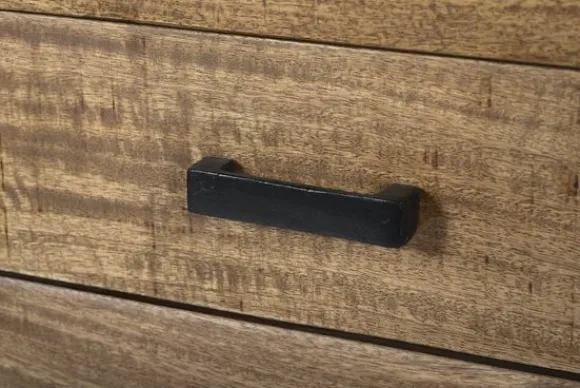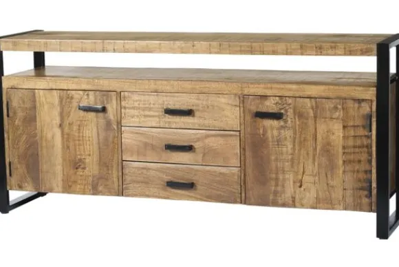 Het dressoir is gemaakt van mangohout in combinatie met zwart gecoat staal. Mangohout is een sterke en duurzame houtsoort met een zichtbare nerfstructuur en natuurlijke variatie in het hout. Het stalen frame zorgt voor stabiliteit en een stevige basis.