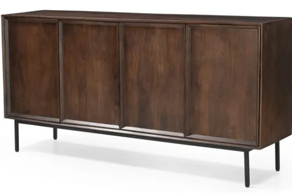 Dressoir Ravenstein van het merk Livingfurn is gemaakt van mangohout en geeft een strakke, minimalistische look aan de ruimte. Het dressoir biedt voldoende opbergruimte achter de greeploze deuren.