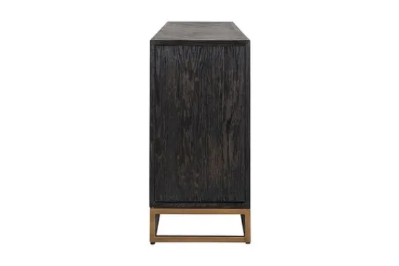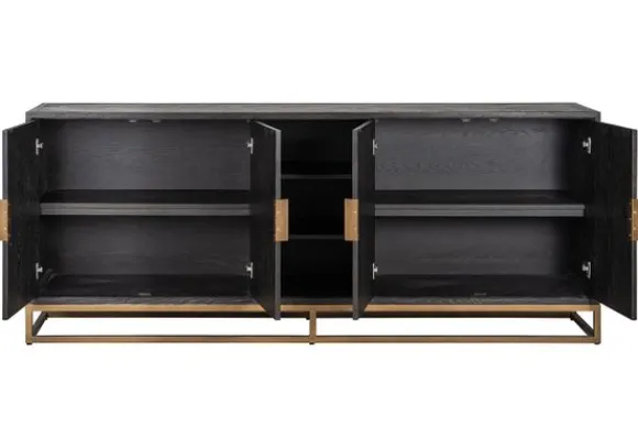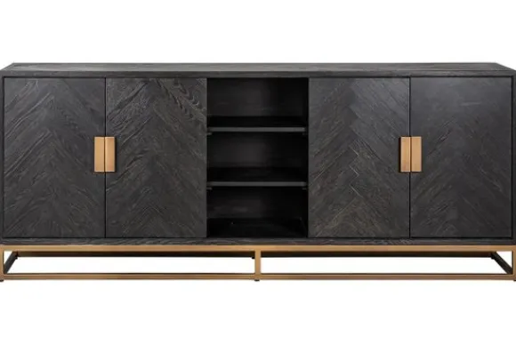Dressoir Blackbone Brass 210693 van het merk Richmond Interiors is een elegant en stoer dressoir met voldoende opbergruimte. Het dressoir heeft vier deuren waar in totaal vier vakken achter zitten om al je spullen netjes op te kunnen bergen. In het midden bevinden zich drie open vakken om eventueel decoratie neer te zetten. Deze boekenkast past goed in hotel chic en industrieel gestijlde interieurs.
