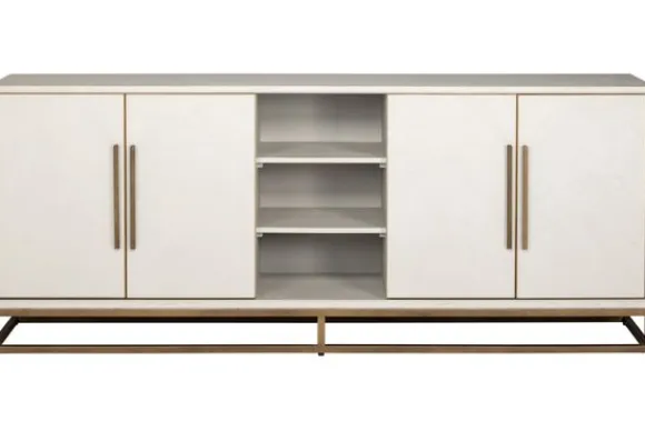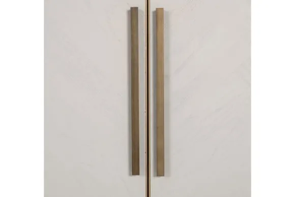 Dressoir Whitebone 211840 van het merk Richmond Interiors is een elegante, maar toch ook een stoer dressoir. Het dressoir is gemaakt van eiken fineer, waarvan de delen in een chique visgraatmotief zijn gelegd. Fineer is een dun laagje hout dat op plaatmateriaal wordt aangebracht. Dit wordt geproduceerd door een stam in dunne laagjes te snijden, hierdoor wordt de stam optimaal benut en is er weinig zaagverlies. Het strakke onderstel is gemaakt in de kleur Brass (staal in mat goud). Het dressoir is voorzien van vier deuren waar in totaal vier vakken achter zitten om al je spullen netjes op te kunnen bergen. In het midden bevinden zich drie open vakken om eventueel decoratie neer te zetten.