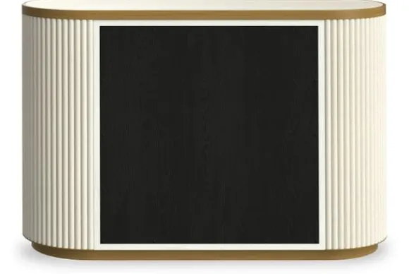 Het dressoir is uitgevoerd met een stevig frame en deuren met een subtiel reliëf. De goudkleurige handgrepen vormen een luxe detail en zorgen voor een mooi contrast.