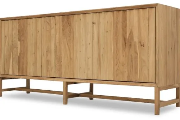Met vier deuren biedt het royale opbergruimte voor servies, boeken of accessoires, terwijl het open onderstel zorgt voor een luchtige en moderne look. Dankzij het strakke ontwerp en natuurlijke materiaalgebruik past dit dressoir perfect in een Scandinavisch, modern landelijk of Japandi interieur.
