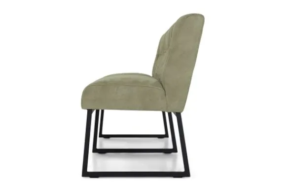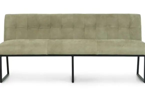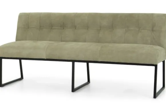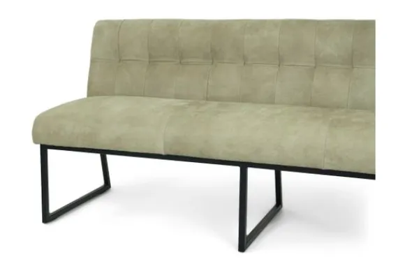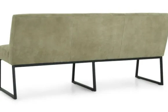 Deze eetbank is voorzien van zwart metalen poten en horizontale intrekkingen in de rugleuning. De Bullock is ook beschikbaar met andere stiksels in de rug. Deze eetbank heeft een simpel, elegant design. Twee handgrepen achter op de rugleuning zijn optioneel.