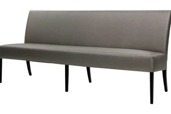 Deze eetbank wordt standaard uitgevoerd met een houten poot in de kleur zwart, een gecapitonneerde rugleuning en zonder handgreep.