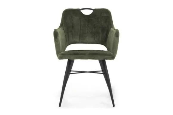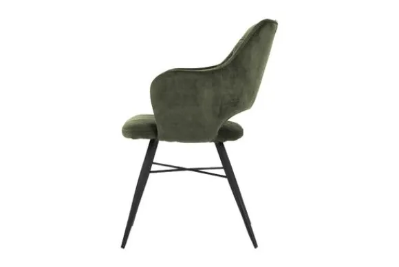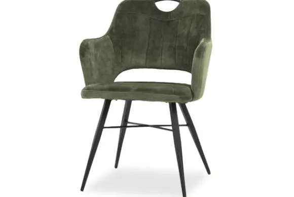 Eetkamerstoel Tirza groen van het merk Olijk is verkrijgbaar in de velvet stof Goldy: antraciet, hunter en cognac. Velvet is een stof die makkelijk te reinigen is en zeer slijtvast is. De stoel is uitgevoerd in de kleur groen en heeft een zwarte metalen poot. De armleuningen van de stoel lopen vloeiend over in de rugleuning, daarnaast heeft de stoel een handgreep die verwerkt is in de bovenkant van de stoel. De rugleuning is versiert met verticale stiksels.