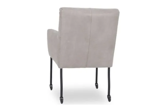 Deze stoel wordt standaard geleverd met zwarte rechte poten met wielen en een geknepen naad. Er kan gekozen worden voor andere poten of een dichte naad onder “Extra Opties”.