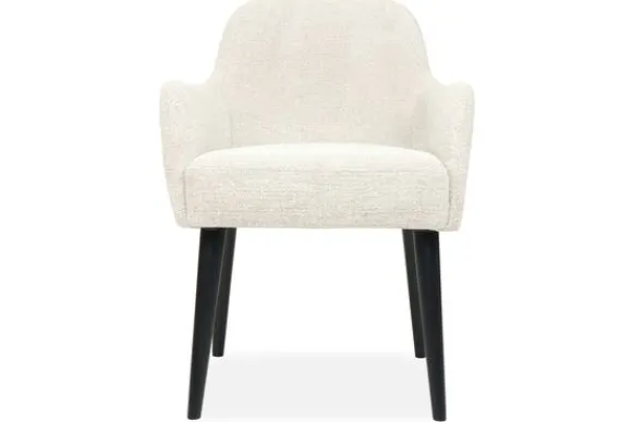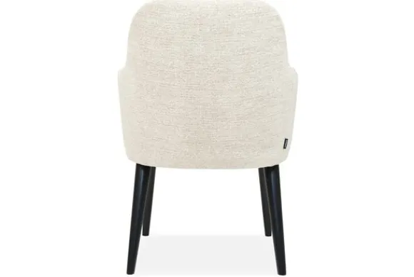De licht uitlopende poten geven de stoel een elegante, luchtige uitstraling, terwijl de comfortabele kuip met armleuningen uitnodigt tot lang tafelen in stijl.