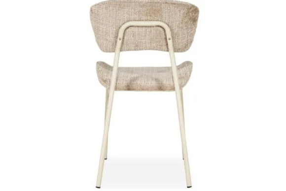 De zitting en rugleuning zijn royaal gevuld en bekleed met een geweven stof die een subtiele textuur heeft. Het lichte onderstel sluit naadloos aan bij de zachte tint van de stof en geeft het geheel een luchtige uitstraling.