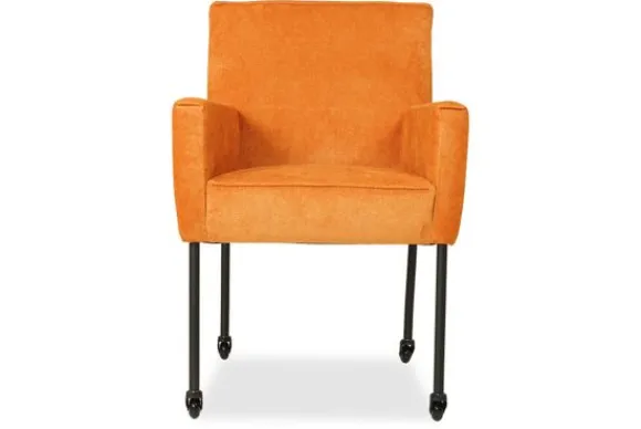 Deze stoel wordt standaard geleverd met skatewieltjes en geknepen naad. Er kan gekozen worden voor andere poten of een dichte naad onder “Stel jouw eetkamerstoel samen”.