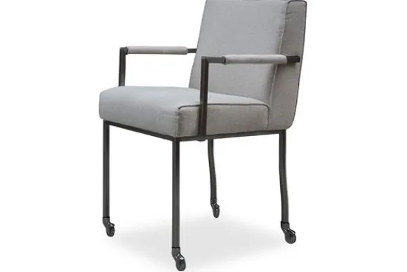 Eetkamerstoel Fun van het merk Divani is verkrijgaar in alle kleuren en verschillende materiaalsoorten zoals stof, kunstleder en rundleder. Deze stoel wordt standaard uitgevoerd met een antraciet metalen poot met skatewieltjes en met een metalen armleuning. Deze Fun eetstoel is afgewerkt met geknepen naden.